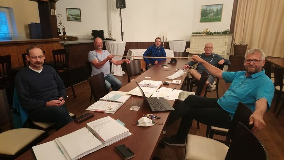 Der MGV Gesamtvorstand hat einen ersten Schritt hin zum Abschütteln der "Corona-Schockstarre" (Peter Spieß) getan und zusammen mit dem Chorleiter (natürlich unter Wahrung der Abstandsregeln, für die extra ein Zollstock zuhilfe genommen wurde, wie unser Foto zeigt) zu einer Vorstandssitzung getroffen. Neben dem weiteren Umgang mit dem einst prall gefüllten Terminkalender im Jubiläumsjahr stand eine Frage ganz oben auf der Agenda: "Wann und vor allem wie setzen wir die Chorarbeit des MGV fort?" Tatsächlich wurde ein Konzeptentwurf auf den Weg gebracht. Natürlich muss hier noch an Details gearbeitet und anschließend das Konzept mit den offiziellen Stellen abgestimmt werden. Dennoch freuen wir uns jetzt schon auf eine Zeit, in der wir wieder gemeinsam singen können.